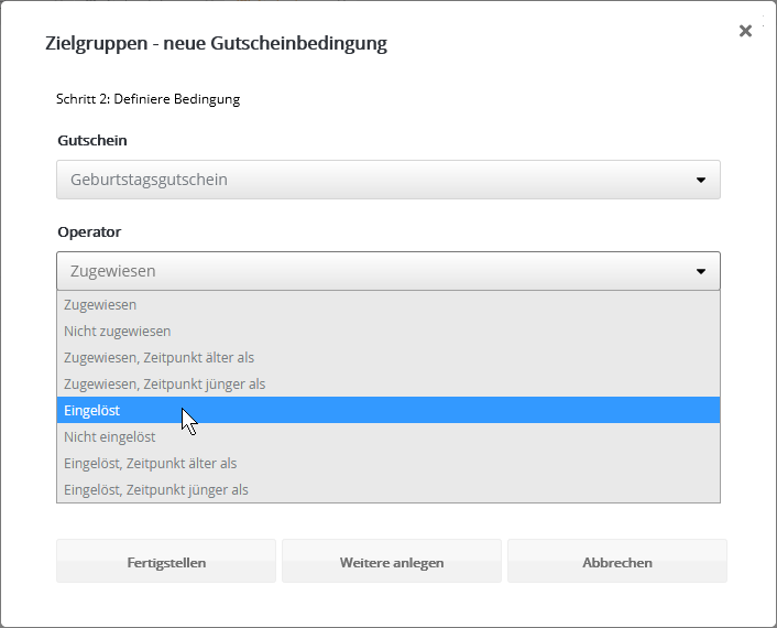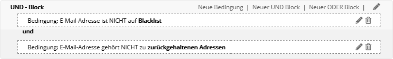 Insbesondere nach dem Kopieren einer vorhandenen Zielgruppe kann das sinnvoll sein, wenn die identischen Abonnenten in Original und Kopie nicht gewünscht sind. Bedingung anhand GutscheinFiltern Sie Abonnenten danach, ob und in welchem Zeitraum die Zuweisung oder Einlösung eines Gutscheins stattfand. Tipp: Um zugewiesene Gutscheine als eingelöst zu markieren, nutzen Sie entweder die Webservice-Funktion 'RedeemVoucherByCode' oder importieren in der Gutscheinübersicht eine CSV-Datei mit den eingelösten Gutscheincodes. Bedingung anhand SelektionMit diesem Bedingungstyp nutzen Sie eine per Webservice angelegte Selektion von Abonnenten als Media Company-Zielgruppe. Der Bedingungstyp ist nur dann sichtbar, wenn per Webservice mindestens eine Selektion angelegt wurde. Das Besondere: In einer Selektion werden Abonnenten anhand einer Liste von IDs gruppiert. So lässt sich eine extern getroffene Abonnentenauswahl als Zielgruppe nutzen, ohne dass in den Media Company-Abonnentendaten ein gemeinsames Merkmal vorliegen muss. Die Details entnehmen Sie bitte der Webservice-Dokumentation, die wir Ihnen gern zusenden. Bedingung anhand des Empfängers (geplant)Diese Bedingung entscheidet, ob ein Abonnent als Empfänger eines bestimmten Mailings vorgesehen war oder nicht. Das bedeutet, dass er in einer Abonnentenliste bzw. Zielgruppe für ein bestimmtes Mailing steht, welches versandt wurde. Im Unterschied zur letztgenannten Bedingung wird der tatsächliche Empfang jedoch nicht geprüft. Es sind auch alle Empfänger enthalten, die das Mailing z. B. aufgrund von Bounces, Blacklists oder serversseitigen Spamfiltern nicht empfangen haben. Bedingung anhand des Empfangens (zugestellt)Diese Bedingung entscheidet, ob jemand ein bestimmtes Mailing empfangen hat oder nicht. Das Mailing gilt als empfangen, wenn der E-Mail-Server des Abonnenten eine positive Rückmeldung erteilt hat. Im Schritt nach dem Empfang ist es dennoch möglich, dass das Mailing beim Empfänger in einem Spamordner landet. Bedingung anhand des BounceverhaltensDamit legen Sie Bedingungen anhand der Zustellungen oder Nichtzustellungen eines bestimmten Mailings an. Bedingung anhand Blacklist bzw. Zurückgehaltener AdressenAbonnenten, deren E-Mail-Adresse auf einer Blacklist oder der Liste der zurückgehaltenen Adressen steht, werden automatisch vom Versand ausgeschlossen. Dieselben* Abonnenten lassen sich per Zielgruppe filtern, etwa um sie beim Export Ihrer Abonnentendaten ebenfalls auszuschließen. Die kombinierte Zielgruppe sieht wie folgt aus: