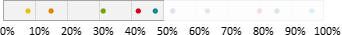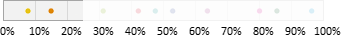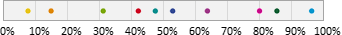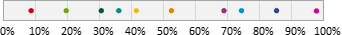 Auswahl-Wahrscheinlichkeit in ProzentGeben Sie einen Prozentwert zwischen 0 und 100% ein. Mit dieser Wahrscheinlichkeit gehört ein Abonnent zur Zielgruppe. Beispielsweise bewirkt ein Wert von 25%, dass ungefähr (siehe Hinweis) ein Viertel aller Abonnenten zur Zielgruppe gehören. Dazu verteilt Media Company alle Abonnenten auf einem Zahlenstrahl zwischen 0 und 100%. Bei 10 "bunten" Abonnenten könnte eine Variante so aussehen: