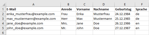 Abonnenten: ImportWahrscheinlich haben Sie bereits eine Liste von Adressen zusammengestellt, die Sie per Newsletter anschreiben möchten. Über das universelle CSV-Dateiformat lassen sich Ihre Adressen aus nahezu jeder Datenbank oder Tabellenkalkulation (z. B. Microsoft Office oder Open Office) exportieren und anschließend in Media Company importieren. Um die Zuordnung der Spalten (z. B. Vorname, Nachname, E-Mail) beim Import zu erleichtern, sollte die erste Zeile Ihrer CSV-Datei aussagekräftige Spaltenüberschriftten enthalten. Ein Beispiel: