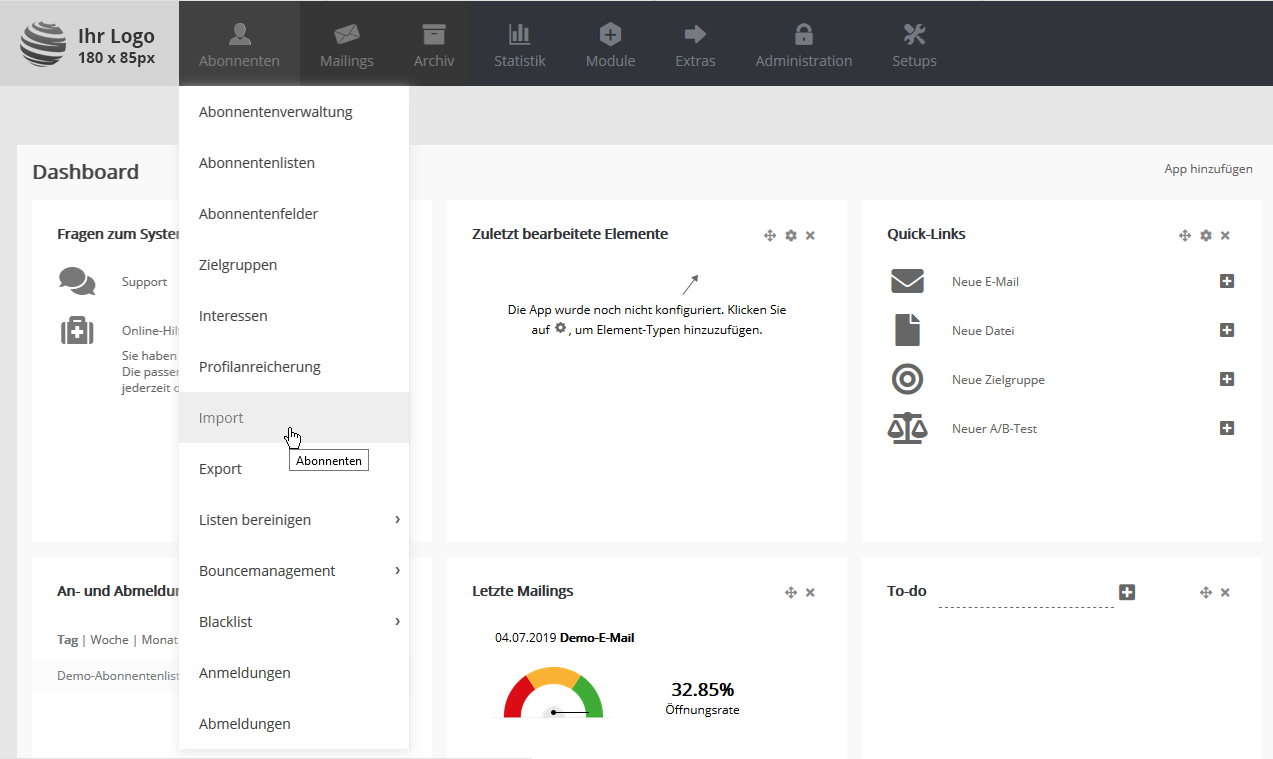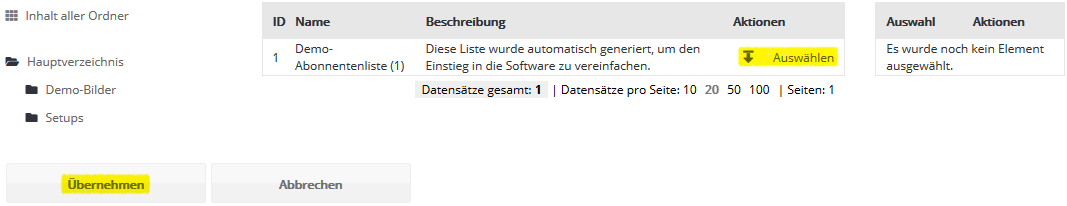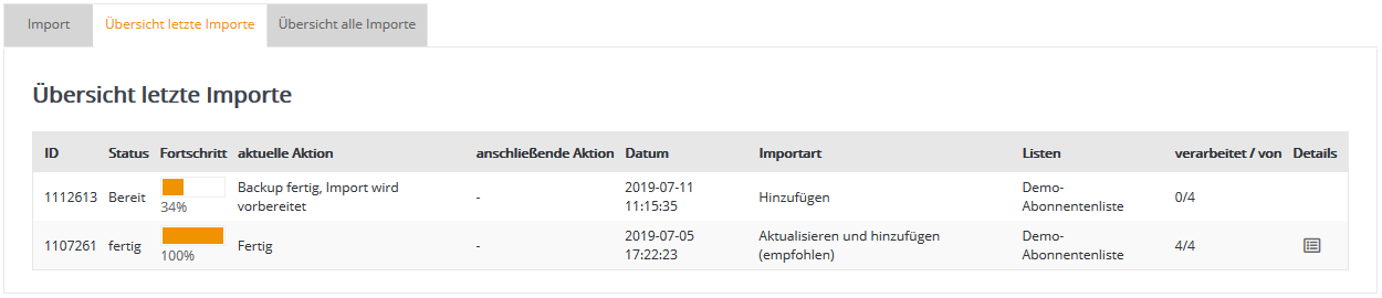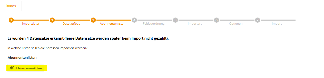 Schritt 3 - AbonnentenlistenWählen Sie nun aus, in welche Media Company Abonnentenliste ihre CSV-Datei importiert werden soll. Falls Sie zuvor keine eigene Abonnentenliste in Media Company angelegt haben (siehe Menü Abonnentenlisten), steht zum schnellen Einstieg die leere Abonnentenliste 'Demo-Liste' bereit. Diese Liste wird in der Regel bei der Einrichtung Ihres Media Company Kontos angelegt und zur Demonstration mit einem Beispiel-Abonnenten befüllt.