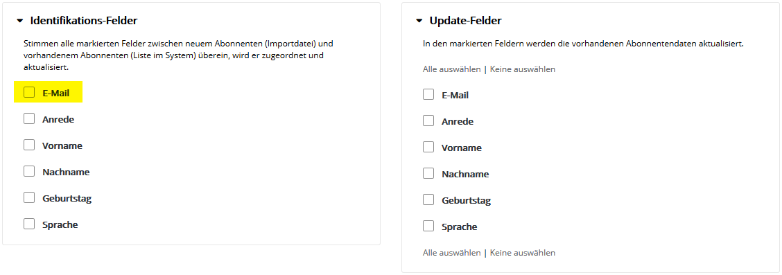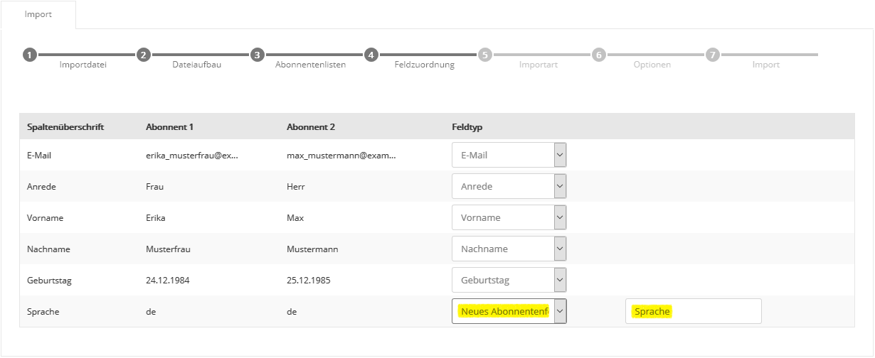Auch die Auswahl mehrerer Abonnentenlisten ist möglich, falls Sie parallel in mehrere Listen importieren möchten. Klicken Sie nach Auswahl der gewünschten Liste(n) auf 'Übernehmen' und anschließend auf 'Weiter'. Der Name einer Abonnentenliste lässt sich im Menü Abonnentenlisten auch nachträglich jederzeit ändern. Schritt 4 - FeldzuordnungIn Schritt 4 teilen Sie Media Company mit, welche Spalte (z.B. Vorname, Nachname) Ihrer CSV-Datei in welches Media Company Abonnentenfeld importiert werden soll. Zum schnellen Einstieg sind typische Abonnentenfelder wie 'E-Mail', 'Anrede', 'Vorname' und 'Nachname' in Media Company bereits vorhanden.