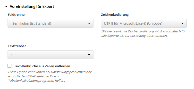 Folgende 'HTML-Editoren' sind in Media Company integriert und nutzbar: Grundeinstellung ExportHier legen Sie die Voreinstellung für den Export von CSV-Dateien fest, z. B. für den Export von Abonnentendaten. Bei der Durchführung jedes Exportes können Sie bei Bedarf auch eine abweichende Einstellung wählen. Standardeinstellung ist die Option 'UTF-8 für Microsoft Excel® (Unicode)', technisch gesprochen 'UTF-8 mit BOM'. Dieses Format wird von den meisten Officeanwendungen automatisch erkannt, so dass Umlaute und Sonderzeichen ohne manuelle Formatwahl korrekt importiert werden. StatistikeinstellungenTragen Sie Ihre eigenen Maximalwerte ein, um die rot|gelb|grün Farb-Umschaltung der Statistik-Anzeige für Öffungsrate, Klickrate und Bouncerate an die typischen Werte Ihrer Mailings anzupassen. Nur Ihre besten Mailings sollten den grünen Bereich erreichen. Die Farb-Umschaltung erfolgt automatisch in Drittel-Stufen des eingetragenen Maximalwertes. Empfehlung: Notieren Sie aus der Statistik Ihrer bisherigen Mailings die Durchschnittswerte für Öffnungsrate, Klickrate und Bounces. Damit dieser Durchschnittswert zukünftig im mittleren Drittel der Skala landet, tragen Sie das Doppelte dieses Wertes als Maximum in das jeweilige Feld ein. Tragen Sie z. B. 30% als Maximum ein, dann werden anschließend die Werte bis 10% rot, bis 20% gelb und darüberliegende Werte grün gefärbt. Sie sehen sofort, ob Ihr aktuelles Mailing über- oder unterdurchschnittlich abschneidet. Typische Durchschnittswerte: