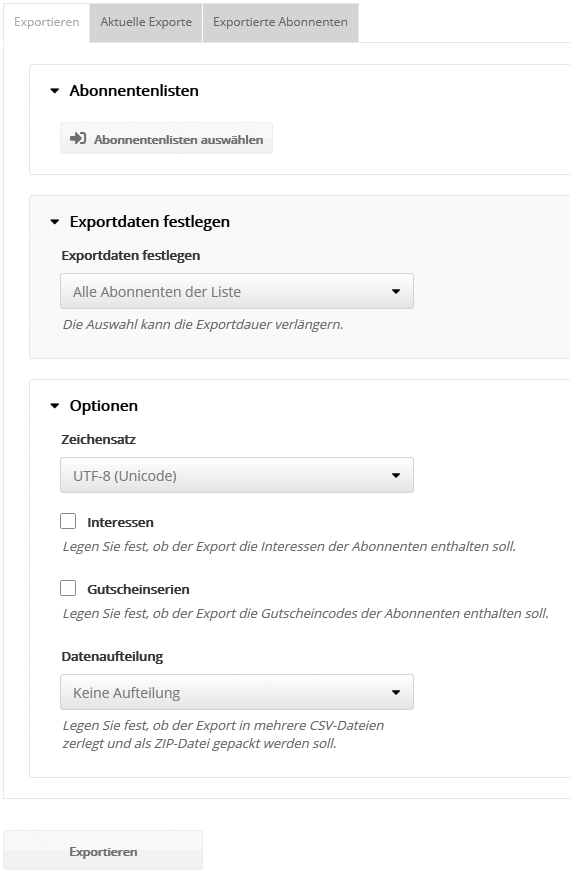 Abonnenten: ExportAbonnentenlisten lassen sich aus Media Company als CSV-Dateien exportieren. Damit können Sie lokale Backups Ihrer Abonnentenlisten anlegen oder den Inhalt bearbeiten und anschließend per Import-Methode 'Aktualisieren' erneut importieren.