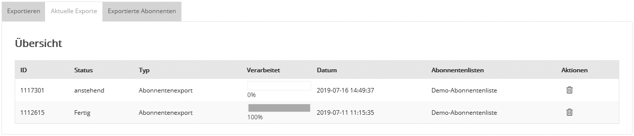 Durch Klick auf die Schaltfläche 'Exportieren' startet Media Company den Export und wechselt zu 'Aktuelle Exporte'. Hier sehen Sie den Fortschritt des aktuellen Exports. Dem Verlaufsbalken sowie dem jeweils angezeigten Status entnehmen Sie, wann der Export erfolgreich abgeschlossen ist. Im Reiter 'Exportierte Abonnenten' finden sie die Export-Datei, die Sie nach einem Klick auf 'Download' auf Ihrem Computer speichern können.