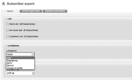 Subscribers lists can be exported from Media Company as CSV – files. An advantage, for example, is that you can back up the address lists in this way. In the tab 'Export’, you can make choices of the lists that have to be exported. Per export only one subscriber list can be chosen. If you only want to export certain data records, you can decide on 'Limitations’. |