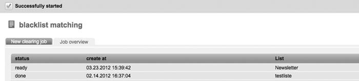 | You will find information on the blacklist and its function in 2.11 Blacklist. Via the function 'Blacklist matching', you can coordinate the data records of your subscriber lists with the entries in your blacklist. Detected subscribers will automatically be deleted by Media Company. First, you have got to choose the subscriber list which has to be examined. By clicking the 'OK' button, you will confirm the appearing message to delete the search results. The result will show you how many subscribers were removed due to the fact that they are registered in the blacklist. |
