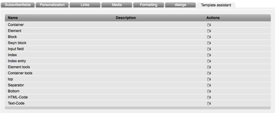 You can chose and place all described placeholders in Media Company with the „input assistance“ (last tab: template assistance). Tab HTML Preview:HTML preview shows your created basic layout. So you can proof the structure of your elements and contents. Tab Text inputThis tab gots the function, that your newsletter can also be shown just in textformat (p.e. For email clients, who don't support multipart-formats). Here you need the same placeholders like before, but without html source code. |