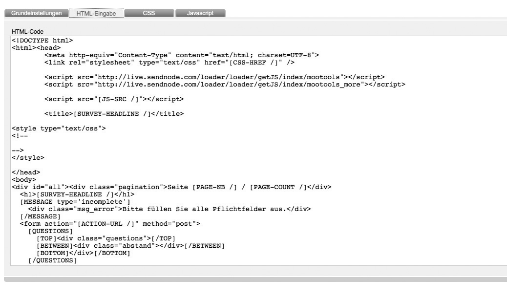 Insert your entire html source code. By creating a new template, Media Company generates a sample html source code with all important survey-placeholders automatically in this tab.