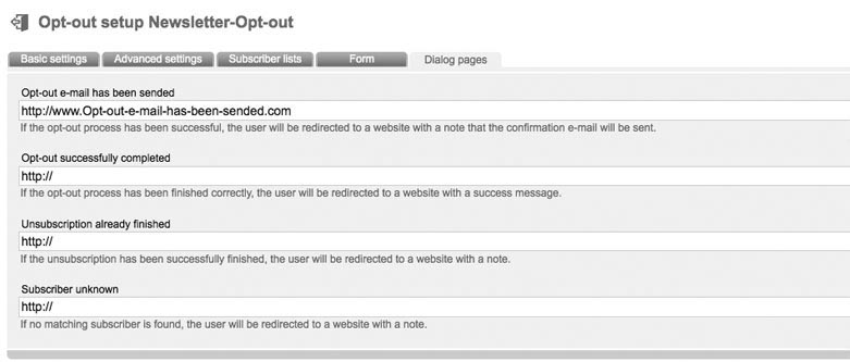 Enter a name and an optional description. Choose the 'mode' (important). The following modes are supported by 'Media Company': Double-optout with confirmation e-mail: after unsubscribe from your website or your newsletter a confirmation email will be send automatically. Optout will be activated after clicking the confirmation link in this email. After successful unsubscription the former subscriber will get a last email („You unsubscribed successfully of our newsletter.“) Double Optout: Like described before, but without sending of a „successful unsubscription“ e-mail Confirmed Opt-Out (recommended): After unsubsubscription on your website or in your newsletter a „successful unsubscription“ email will be sended immediately. Single Optout: No e-mails will be send. There just will be a message in your browser, that optout was successfull. In Tab 'advanced settings' you can deposit your e-mail address in field 'e-mail forwarding', to be informed about unsubscriptions. Tab 'subscriberlists': Choose your favorite subscriberlist(s), where all unsubscriptions should be logged out. Select the subscriberfields, which should be filled out by your subscribers in tab 'Form'. After clicking 'create form fields' a popup appears, where you can choose and add subscriber fields to your form. Click 'sort formular fields' to arrange your fields. Click 'test form' to open a new tab in your browser with a preview of your form. Source Code of your website is genereated by 'Media Company' by clicking 'Formular soruce code'. A popup appears with your source code. Last tab: Dialog pages |