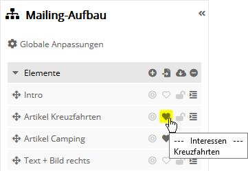 Aufklappen Aufklappen / Zuklappen: Damit können Sie die untergeordneten Ebenen eines Containers oder Elements im Elementenbaum anzeigen oder verstecken. Die Funktion dient ausschließlich der Übersichtlichkeit im Elementbaum und hat keine Auswirkung auf das Mailing selbst.