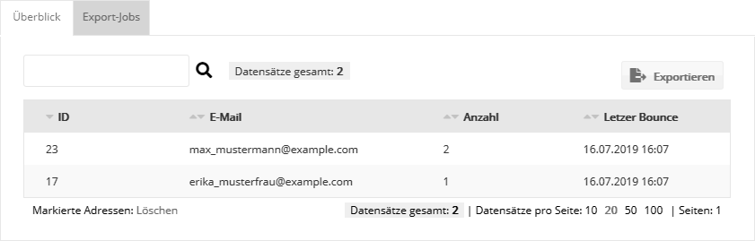 Reiter 'Überblick'Hier werden alle E-Mail-Adressen aufgelistet, deren Versendungen aufgrund von drei aufeinanderfolgenden Hardbounces zurückgehalten werden. Diese Adressen werden auf der Media Company-internen 'Retained List' gesammelt. Verwaltet werden hier ausschließlich die reinen E-Mail-Adressen, unabhängig von den dazugehörenden (eventuell ehemaligen) Abonnenten. Oben rechts können Sie mit Klick auf den 'Exportieren'-Button die zurückgehaltenen E-Mail-Adressen als CSV-Datei exportieren. Die erzeugte CSV-Datei lässt sich anschließend auf dem Reiter 'Export-Jobs' herunterladen.
