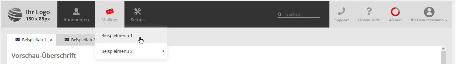 Berührt der Mauszeiger einen Hauptmenüpunkt (Fokus bzw. Mouseover), wird Farbe 2 verwendet. Die gleiche Farbe gilt als Standardfarbe im rechten Menü.