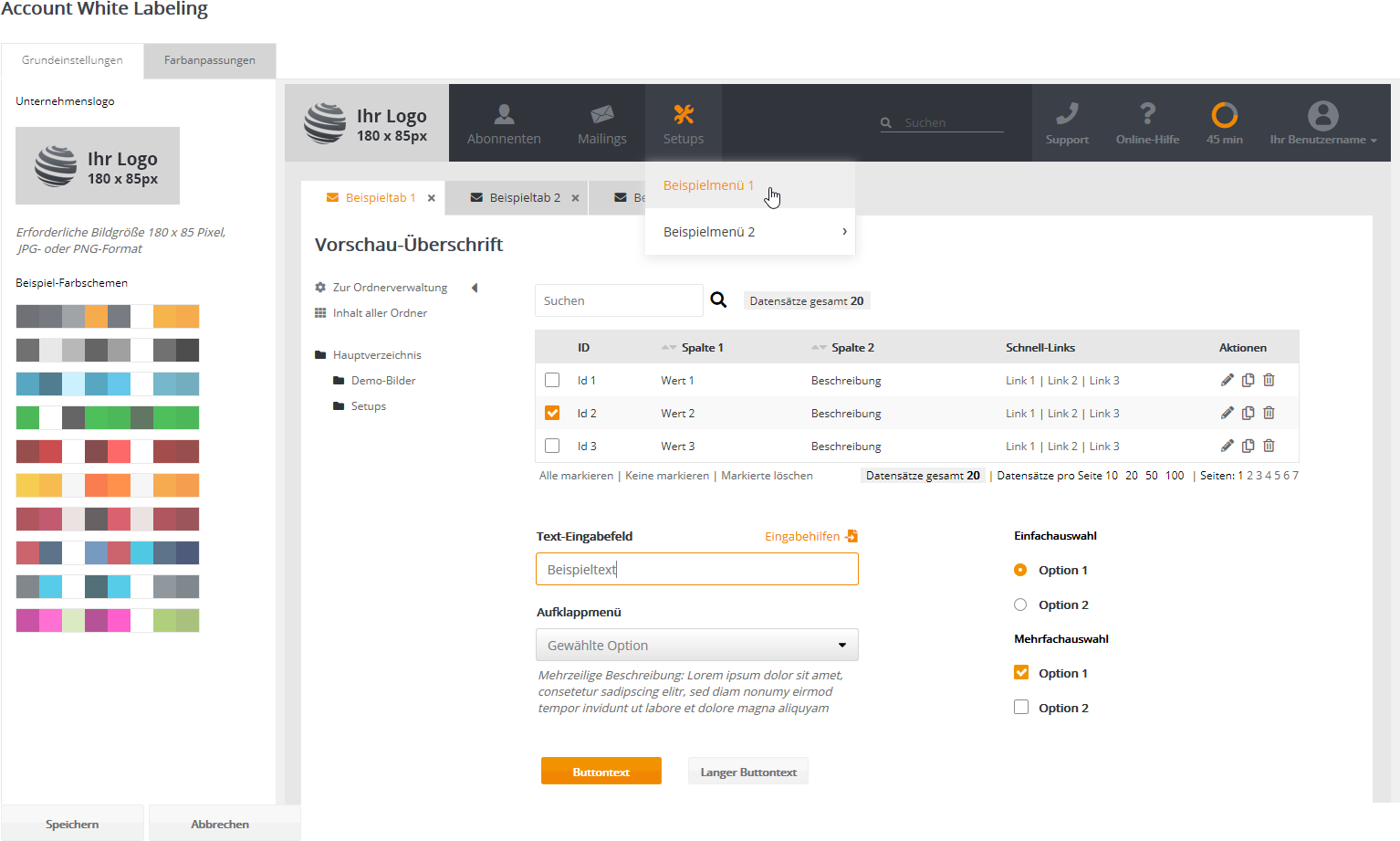 Mit unserem White Label Editor passen Sie das Layout Ihres Accounts mit wenigen Klicks an Ihr Corporate Design an. HTML- oder CSS-Kenntnisse sind dazu nicht erforderlich.
