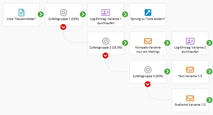 - Die übrigen rund 75% erfüllen die Bedingung nicht und folgen dem roten Pfeil zum Bedingungsbaustein der 'Zufalls-Gruppe 2'. Da hier nur 75% statt 100% der ursprünglichen Abonnenten ankommen, muss der Bedingungsbaustein für Gruppe 2 auf 1/3 bzw. 33.3% filtern, um ungefähr dieselbe Gruppengröße zu erreichen (3/4 * 1/3 = 1/4).