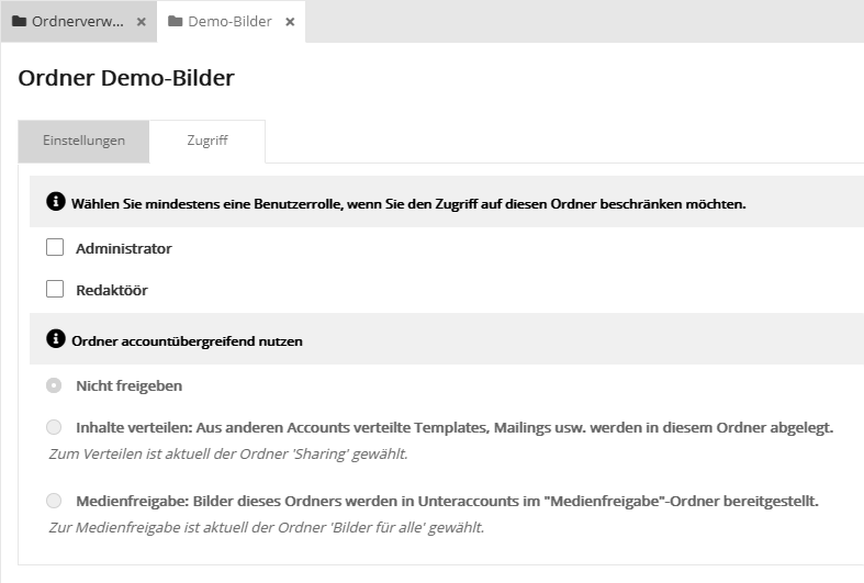 Neuen Ordner erstellenWählen Sie zunächst auf der linken Seite den übergeordneten Ordner, im dem der neue Ordner entstehen soll. Klicken Sie dann rechts oben auf "Neuer Ordner". Geben Sie dem Ordner einen Namen und optional eine Beschreibung. Anschließend ist der neue Ordner auf der rechten Seite sichtbar und allen Inhalten zur Verfügung. Ordner bearbeitenUm weitere Eigenschaften eines Ordners festzulegen, klicken Sie auf das Bearbeiten-Symbol des gewünschten Ordners. Reiter 'Einstellungen'Neben Name und Beschreibung können Sie den automatisch vergebenen Stellvertreter ändern (in der Regel nicht notwendig). Reiter 'Zugriff'Im oberen Bereich können Sie Benutzerrollen auswählen, wenn nur bestimmte Nutzer Zugriff auf die Inhalte dieses Ordners erhalten sollen. In der Standardeinstellung ist keine Einschränkung gewählt, d. h. alle Nutzer haben Zugriff.